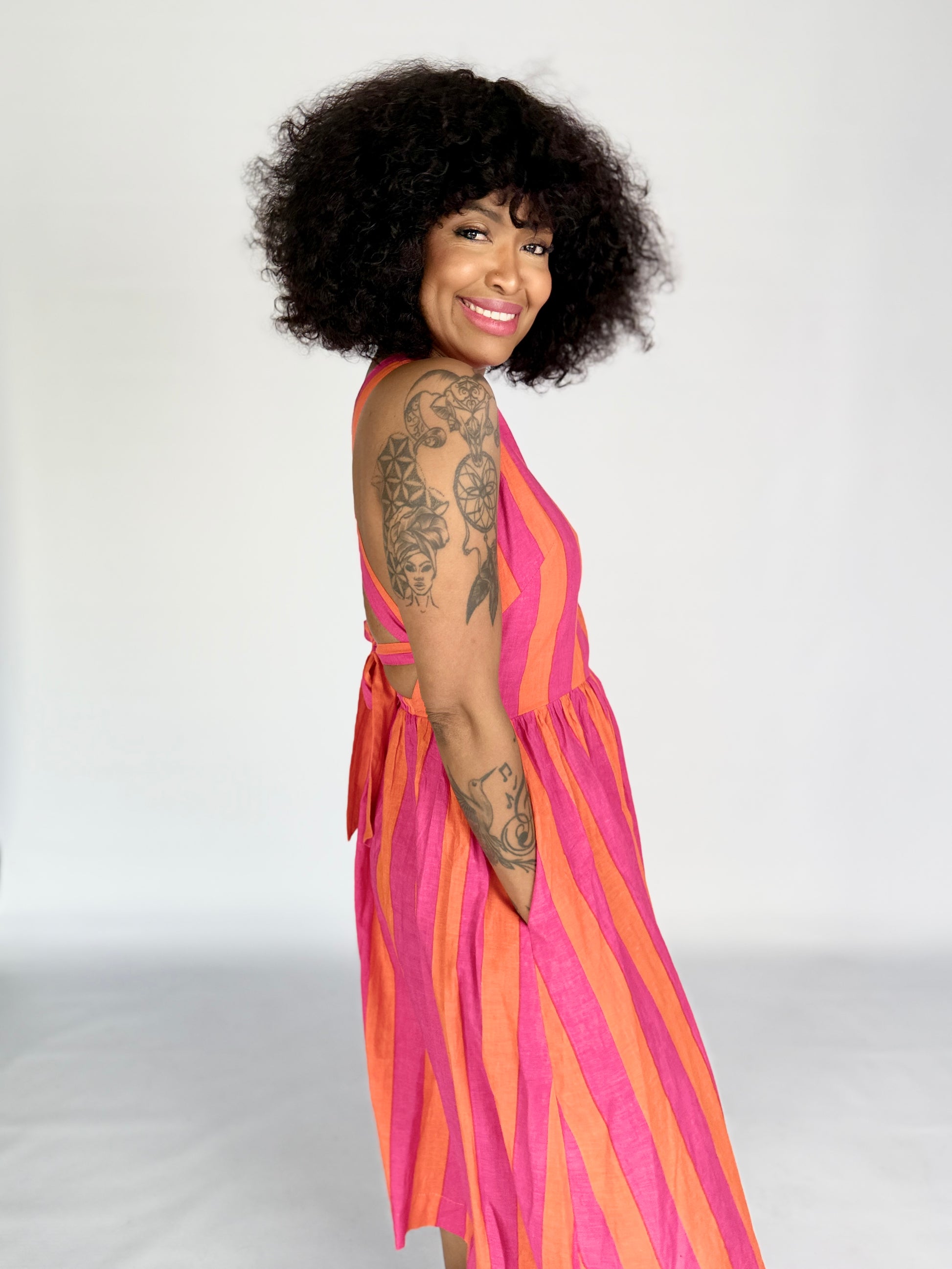 Ladies Dress - Criss Cross back l Pink and Orange Stripe